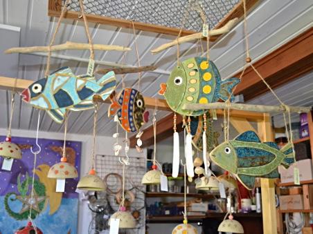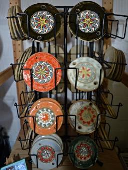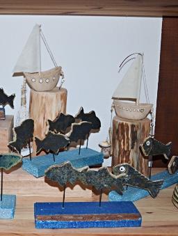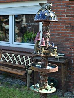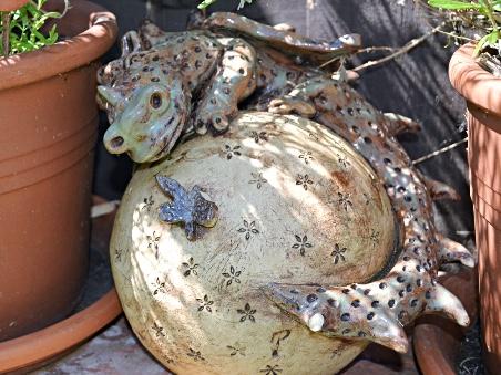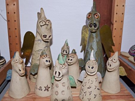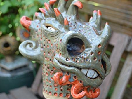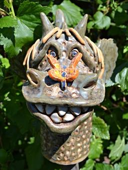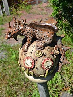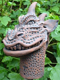 Neben den Drachen fertigt Iris Peter Keramik für drinnen und draußen. Von Zaunhockern und Seifenschalen, bis zu Türschildern, Kugeln, Stelen und anderem. Diese Dinge, und die Drachenköpfe natürlich, kann man bei ihr im Atelier sehen. Und auf Märkten, wenn sie mit Keramik-Kreativ unterwegs ist.